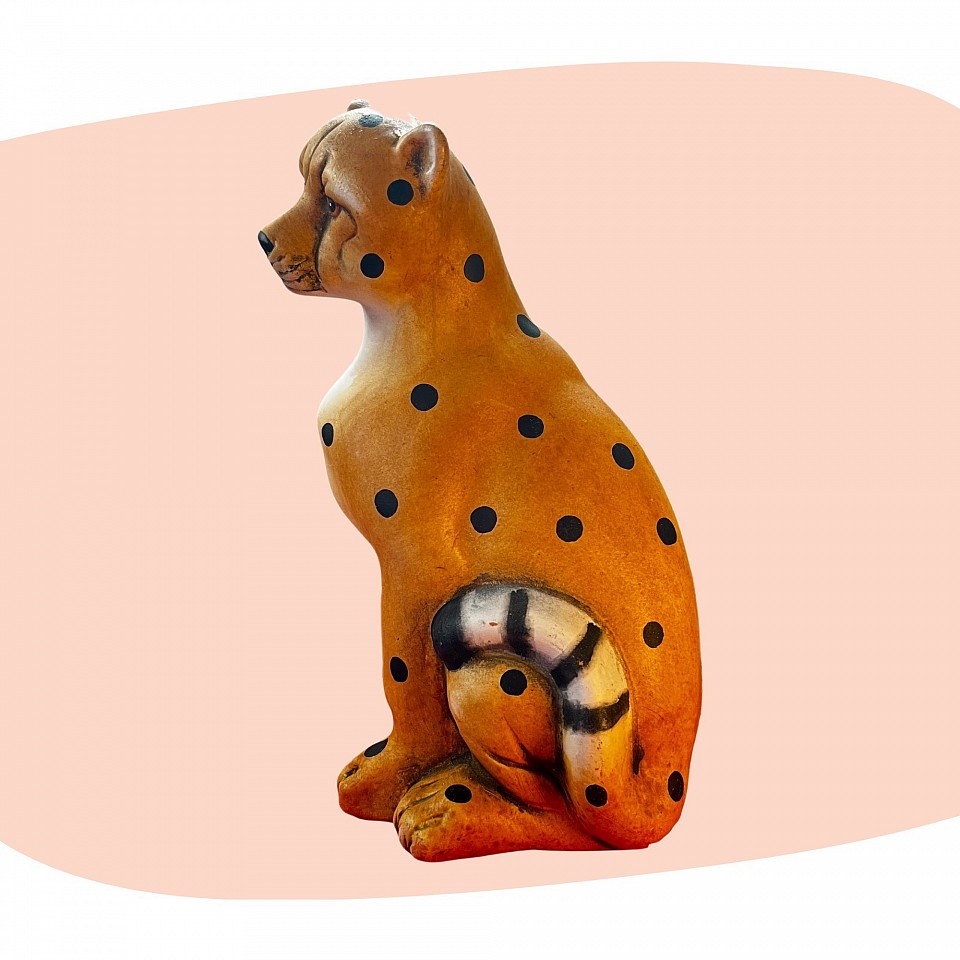 Pièce pleine de charme et de caractère, cette statuette en terre cuite peinte à la main représente un élégant félin tacheté assis avec douceur et fierté. Son regard expressif et sa posture stylisée en font une création à la fois naïve et raffinée, typique des objets décoratifs vintage au charme artisanal.