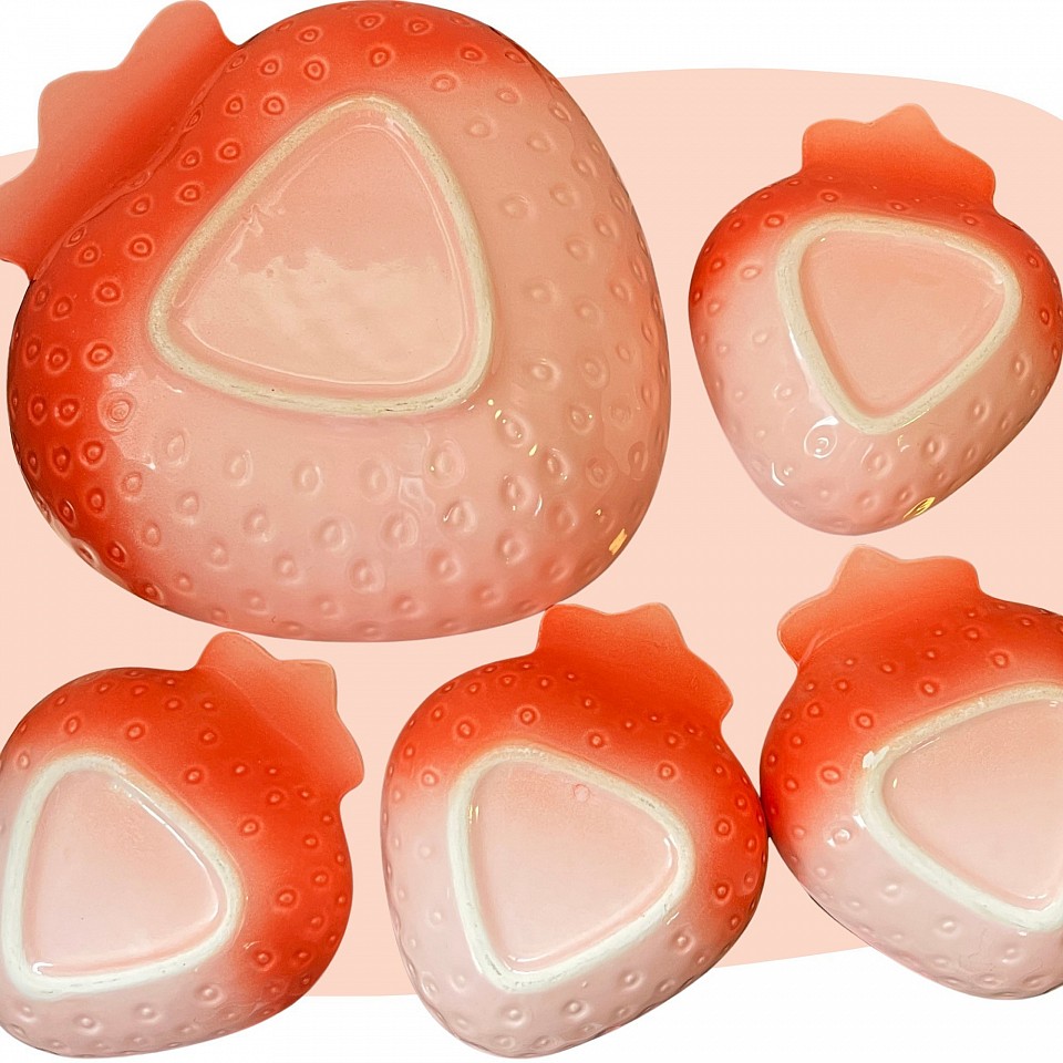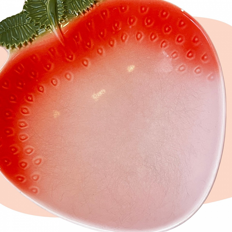 Ce charmant ensemble de 5 plats en céramique aux formes de fraises apportera une touche de fraîcheur et de fantaisie à votre table. Peints dans de tendres dégradés de rose et de rouge, ils sont rehaussés de feuilles vertes finement modelées. Leurs reliefs délicats et leur finition brillante évoquent les créations des années 70, entre art de la table et décoration joyeuse. 🍓🌿