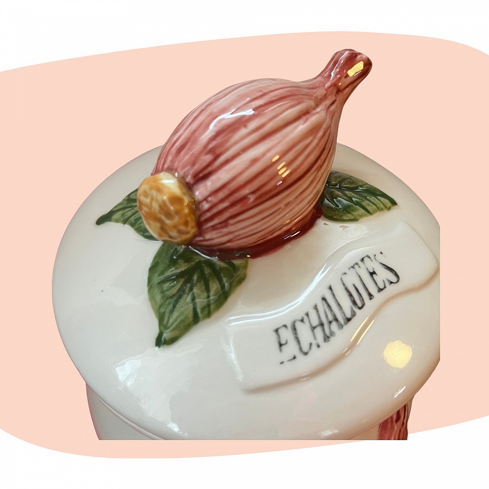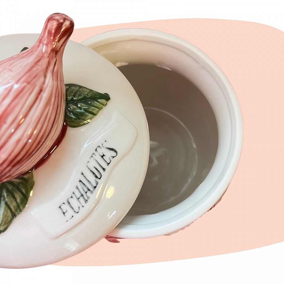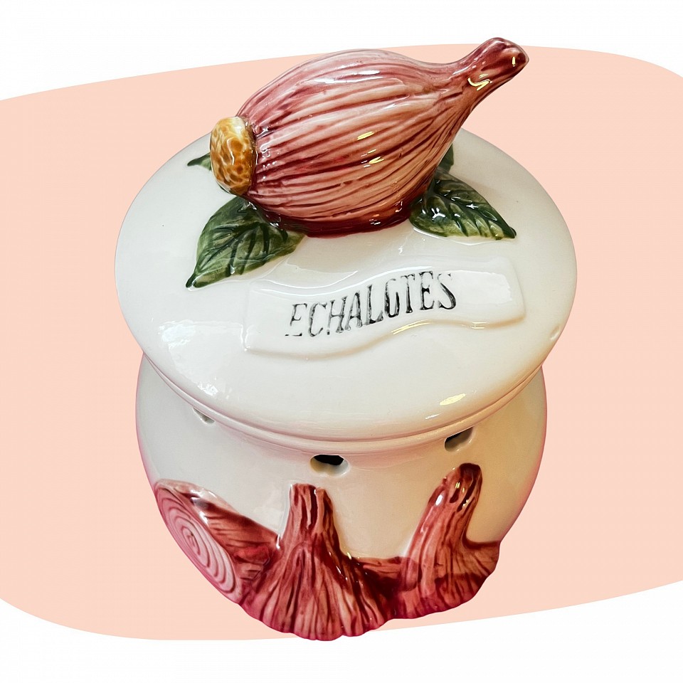 Charmant pot à échalotes en céramique émaillée barbotine, orné d’un décor en relief représentant des échalotes et des feuilles finement modelées et peintes à la main. Le couvercle est surmonté d’une échalote en volume, apportant une touche rustique et authentique à cet objet plein de caractère. Les petites ouvertures sur le pourtour assurent une bonne aération, idéale pour la conservation des échalotes. 🧅