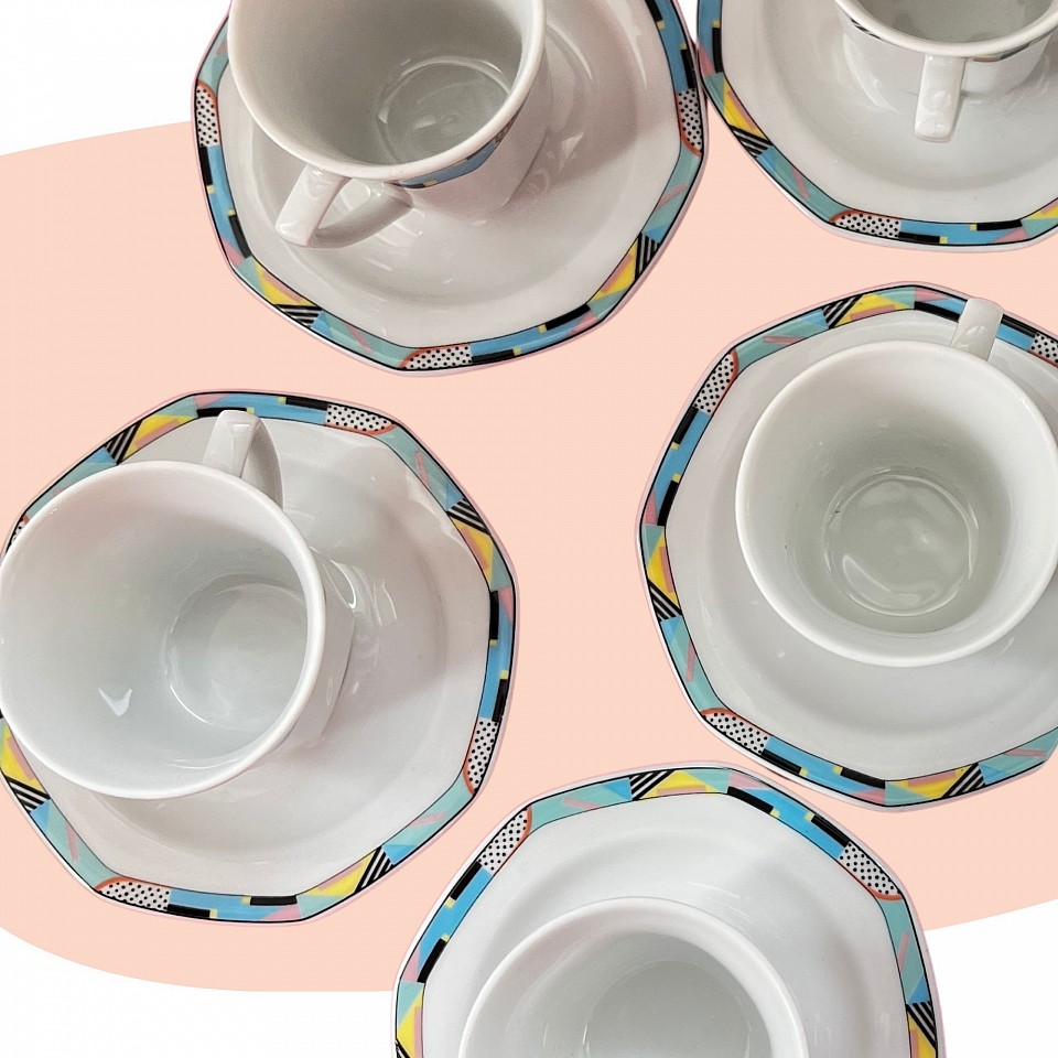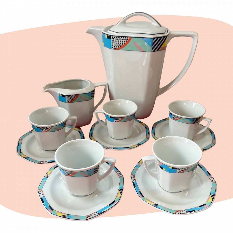 Superbe service à café en porcelaine fine signé Winterling Marktleuthen Bavaria, arborant un motif géométrique et coloré typique du design des années 1980. Les lignes franches et les aplats de couleurs vives – turquoise, jaune, rose, noir et blanc – s’inspirent de l’esprit Memphis, pour une allure graphique et résolument moderne.🌈